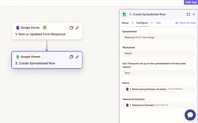 Automação Zapier: extrai 'Nome' e 'Telemóvel' das respostas do Google Forms e grava em Google Sheets. Inclui validação, deduplicação e registos de auditoria para observabilidade.